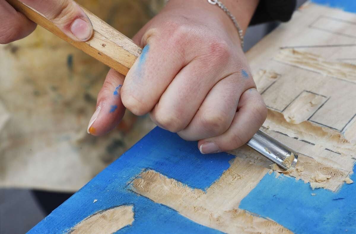Geschnitzt werden dann erstmal als Relief einfache Motive als Rillenbilder. Tiere, Blumen, Figuren und freie Formen können mit den Hohleisen ausprobiert werden.